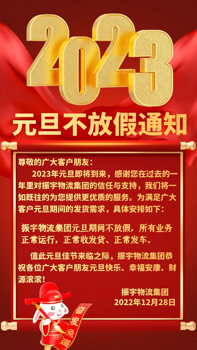 2023年元旦即将到來,感謝您在過去的一年裏對(duì)振宇物流集團的信任與支持,我們将一如既往的爲您提供更優質的服務。爲滿足廣大客戶元旦期間的發(fā)貨需求,具體安排如下: