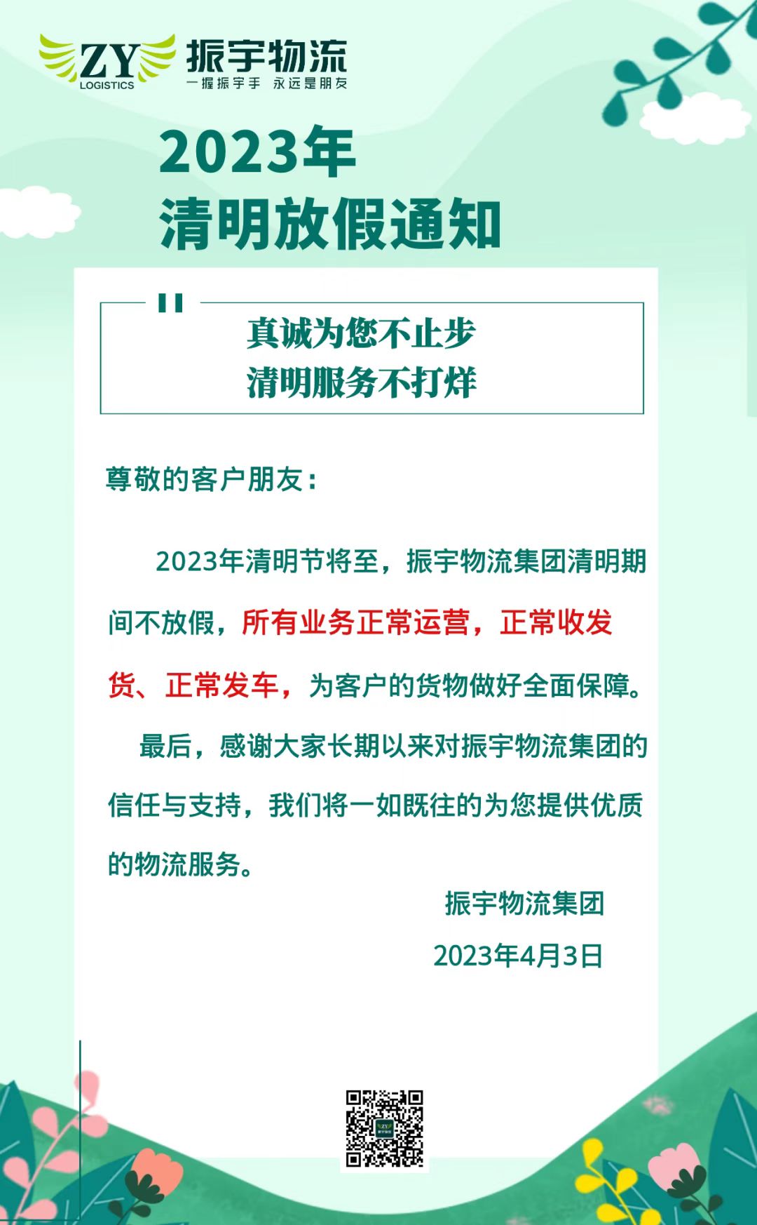 2023年清明節(jié)将至,振宇物流集團(tuán)清明期間不放假,所有業務正常運營,正常收發貨、正常發車,爲客戶的貨物做好全面保障。最後 ,感謝大家長(zhǎng)期以來對(duì)振宇物流集團的信任與支持,在此祝您度過(guò)一個(gè)愉快的假期。