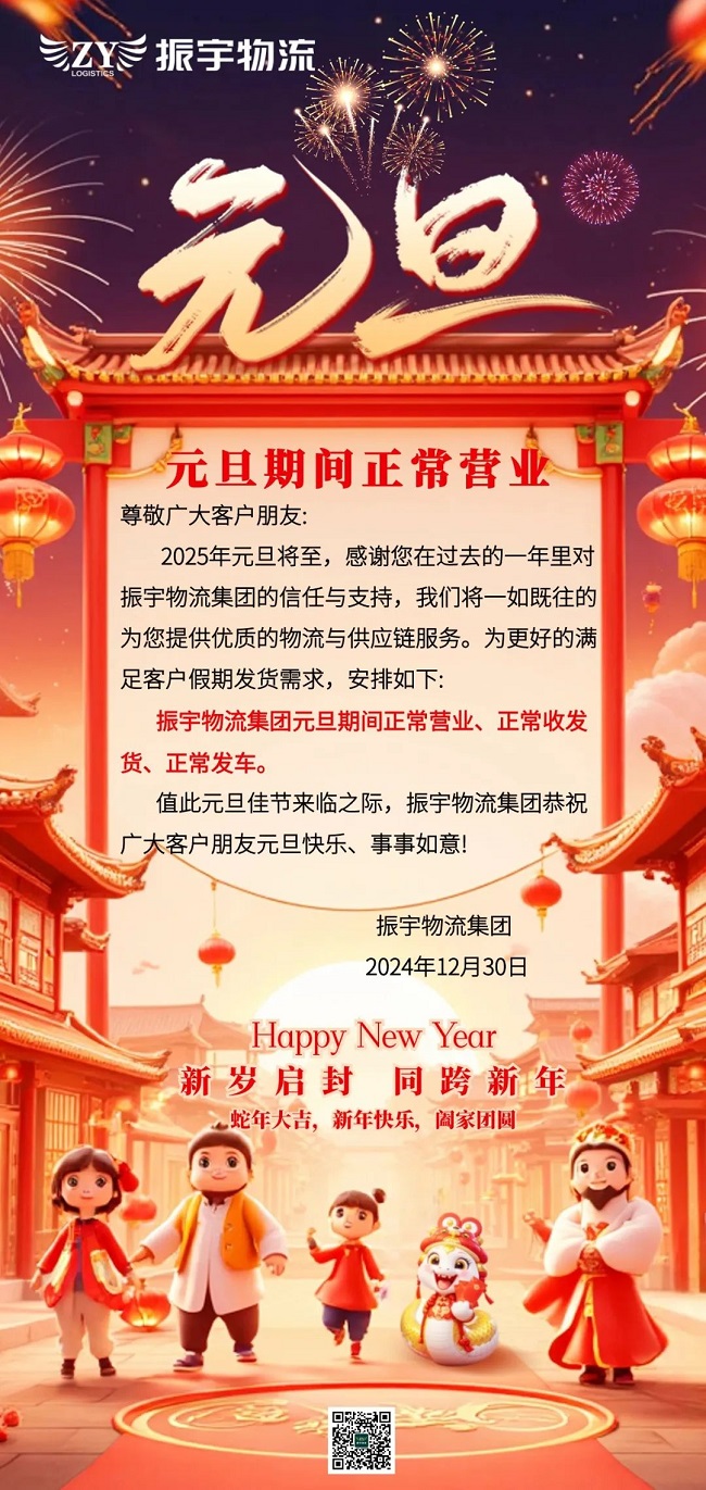 2025年元旦将至,感謝您在過去的一年裏對(duì)振宇物流集團的信任與支持,我們将一如既往的爲您提供優質的物流與供應鏈服務。爲更好的滿足客戶假期發(fā)貨需求,安排如下: