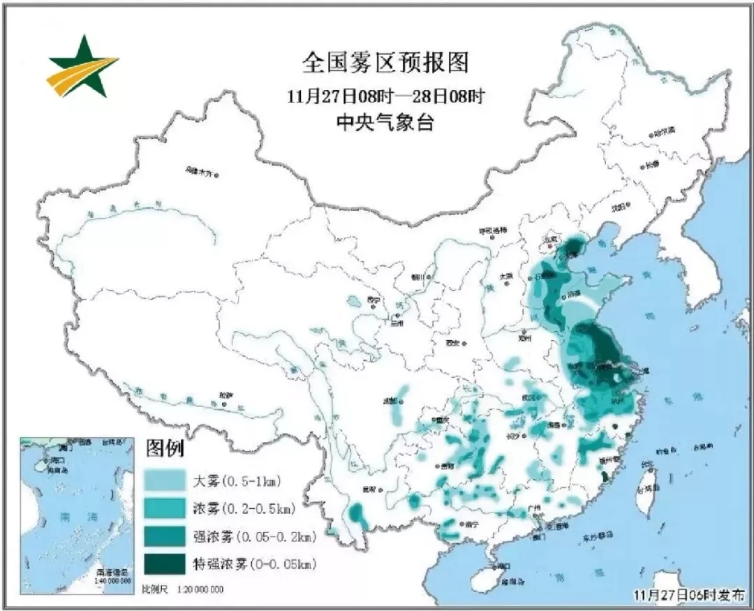 中央氣象台11月27日06時繼續發(fā)布大霧橙色預警,27日早晨至28日早晨,華北中東(dōng)部、黃淮東(dōng)部和南部、江淮 、江漢平原的部分地區将有大霧,其中河北東部、山東西南部、安徽東部、江蘇、上海、浙江北部等地有濃霧或強濃霧,局地有能見度不足50米的特強濃霧。預計華東地區的大霧天氣會一直持續到12月2日,長(zhǎng)達(dá)一周。